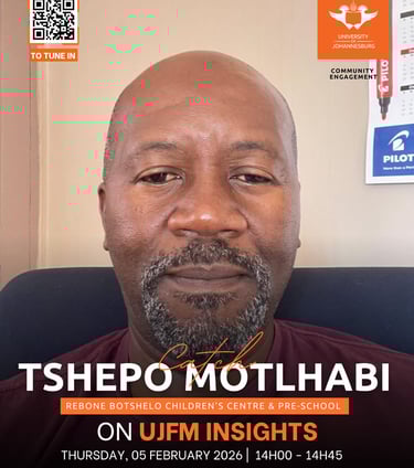 Catch Mr Tshepo Mothlabi on UJFM INSIGHTS today the 5th of February from 14:00 'til 14:45, for a radio interview on the Community Based Organization CBO collaboration with UJ which is ranked the No.1 university in South Africa.